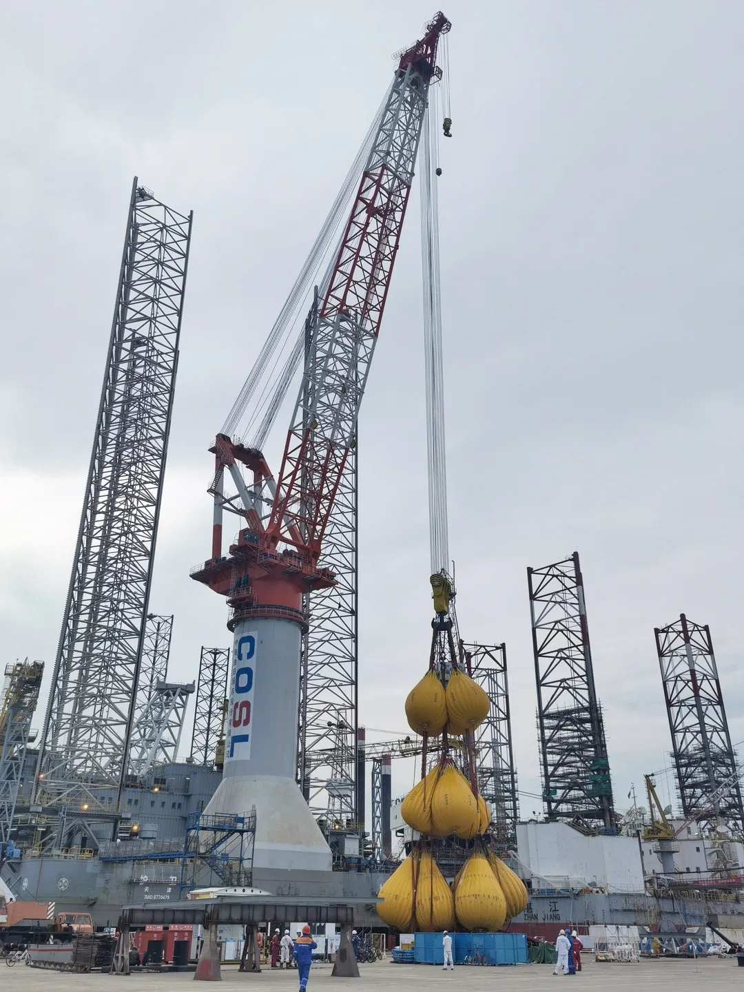 裝備自重840T,吊臂長達(dá)76米,定點吊最大安全工作負(fù)荷800T,全回轉(zhuǎn)吊最大安全工作負(fù)荷650T。設(shè)備吊臂上配備了一個800T主鉤,一個120T副鉤,其中主鉤最大起升高度為甲板面上105米,副鉤最大起升高度甲板面以上113米,能滿足風(fēng)電塔筒、扇葉、電機的安裝需求。