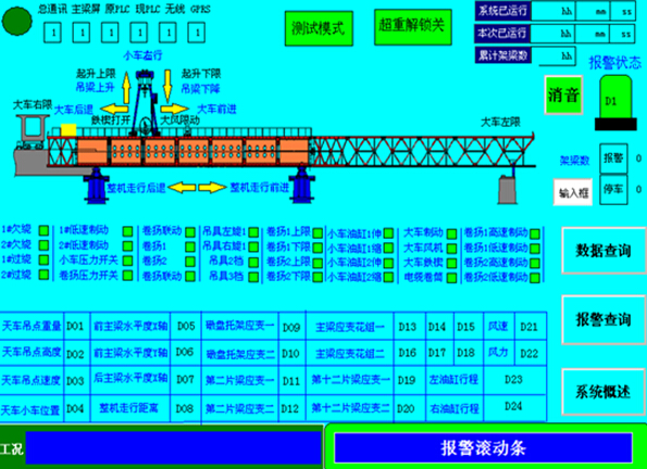 由于該拼裝架橋機(jī)的特殊性,本套系統(tǒng)方案配備有信號(hào)采集裝置(下位機(jī))1臺(tái)和一套圖形顯示終端含存儲(chǔ)(上位機(jī)),能夠?qū)崟r(shí)的顯示所監(jiān)控的各個(gè)參數(shù),并對(duì)所有的監(jiān)控對(duì)象能作出顯示、報(bào)警、數(shù)據(jù)分析、查詢(xún)、記錄及動(dòng)作輸出等功能。數(shù)據(jù)保存能保存30個(gè)連續(xù)工作日。設(shè)備數(shù)據(jù)具有導(dǎo)出功能,通過(guò)USB口或網(wǎng)口可將數(shù)據(jù)導(dǎo)出作為長(zhǎng)久保存用。設(shè)備具備遠(yuǎn)程通訊接口,可將數(shù)據(jù)和視頻通過(guò)GPRS或3G模塊將數(shù)據(jù)發(fā)至服務(wù)器,實(shí)現(xiàn)遠(yuǎn)程監(jiān)控。