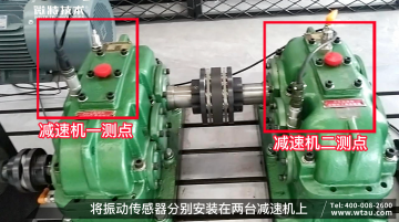 將實驗臺旋轉設備開機運行,將振動傳感器分別安裝在兩臺減速機上