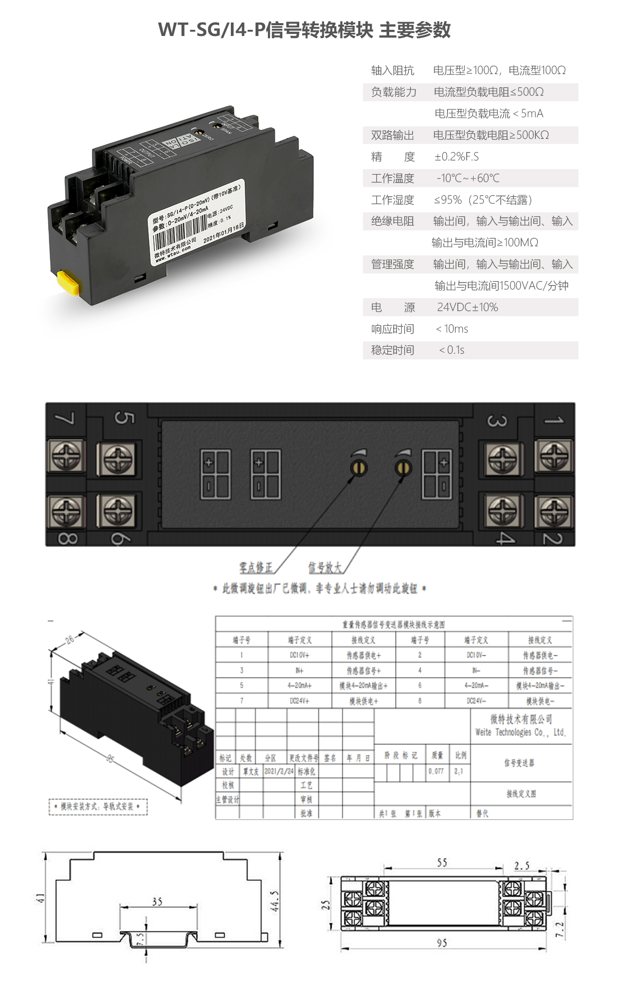 該模塊DC24V供電,35mmDIN導軌安裝,定端子螺栓接線,輸入、輸出、電源三端口全隔離。